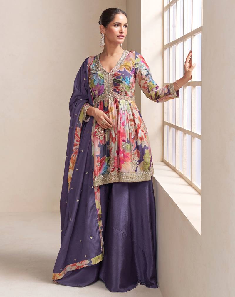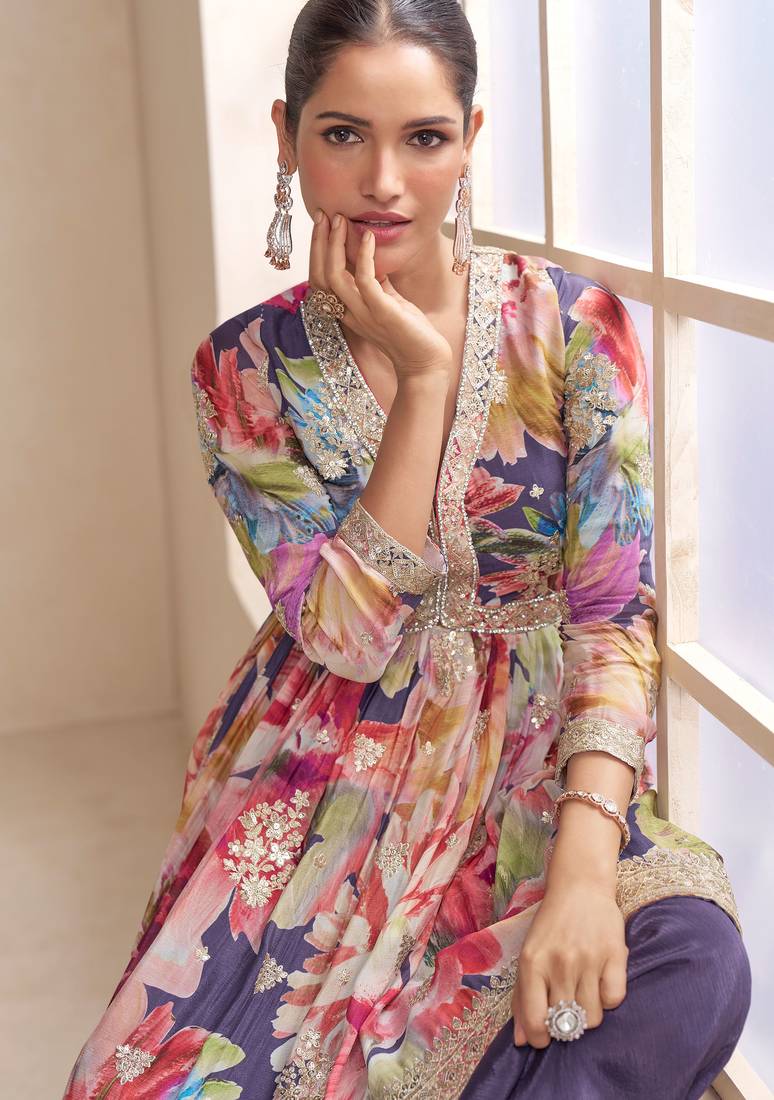 Multi-color chinon silk straight top palazzo suit with zari, stone, sequin and print work, free-size stitched.