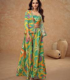| Product Name | Multicolor Embroidered & Digital Print Chinnon Silk Blouse Palazzo Suit With Jacket Free Size Stitching (Size Upto 42") | |