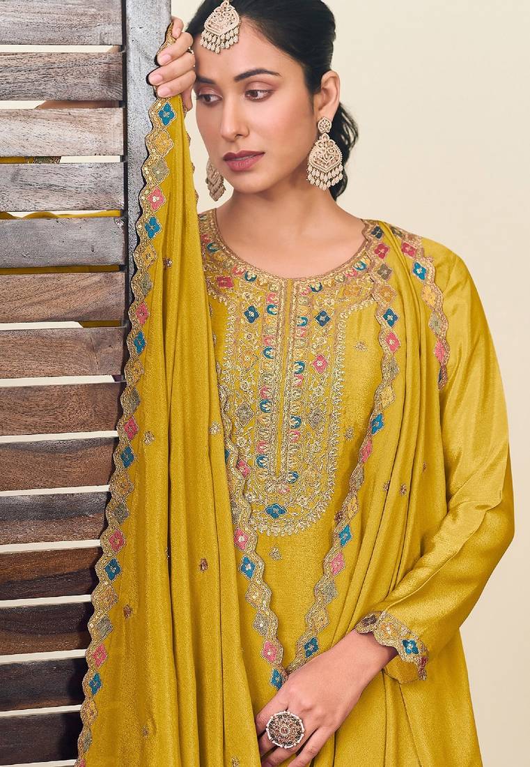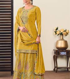 Mustard chiffon sequins work semi stitched salwar suits suits size up to 42