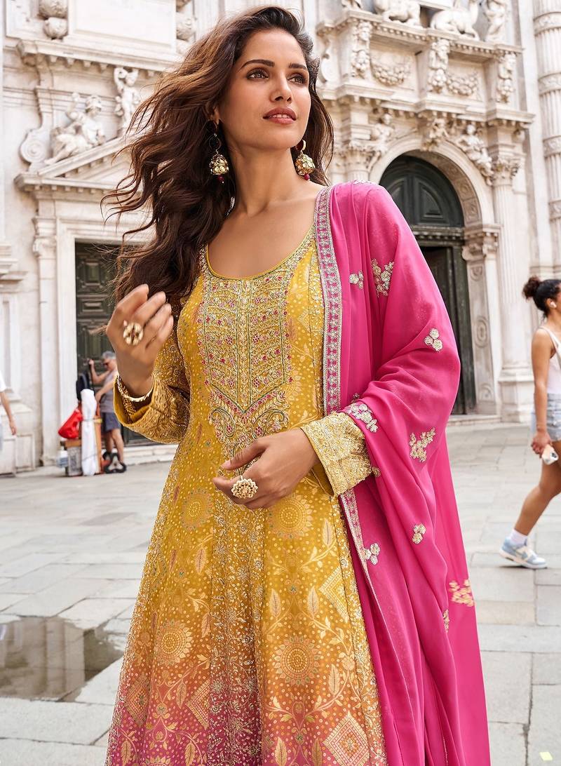 Mustard jacquard sequins work semi stitched salwar suits suits size up to 42