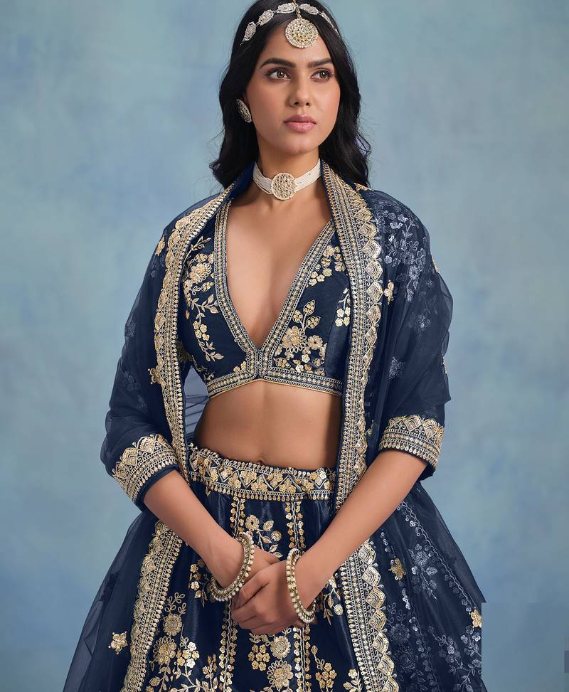 Navy blue art silk sequins work semi stitched lehenga choli size up to 42