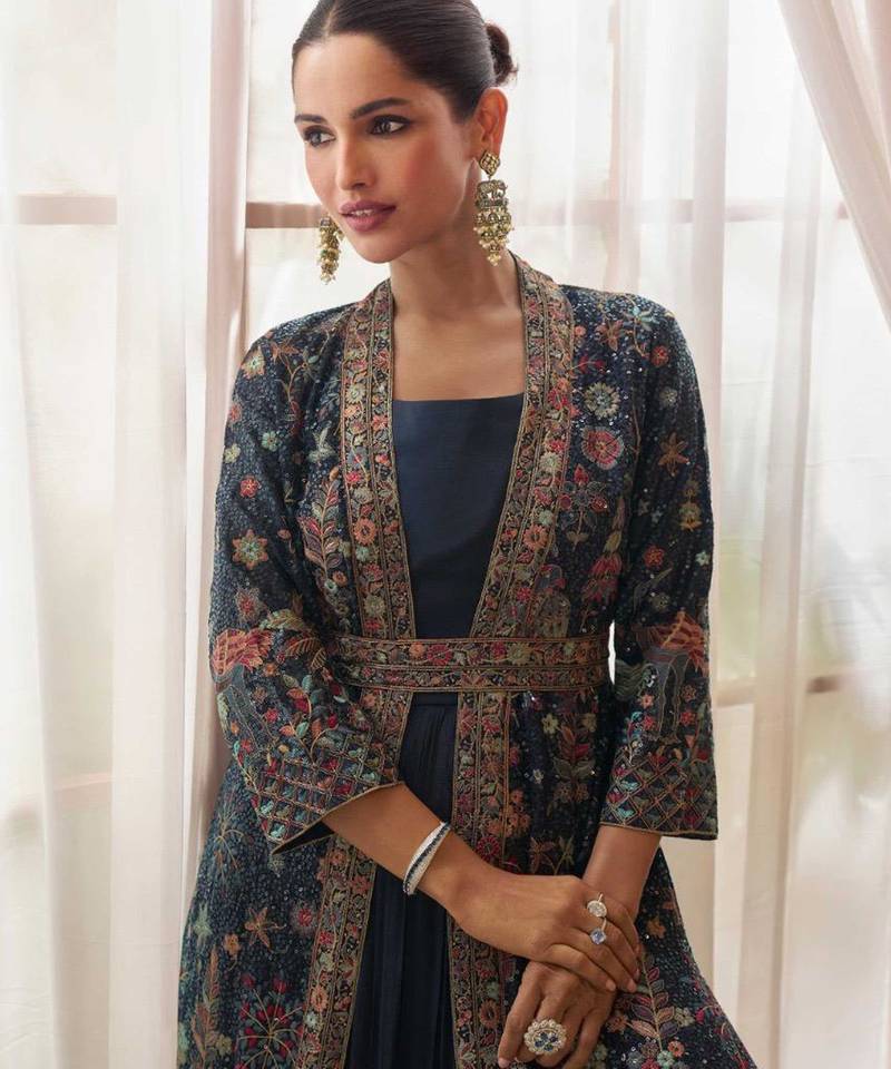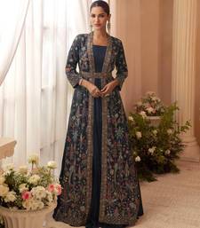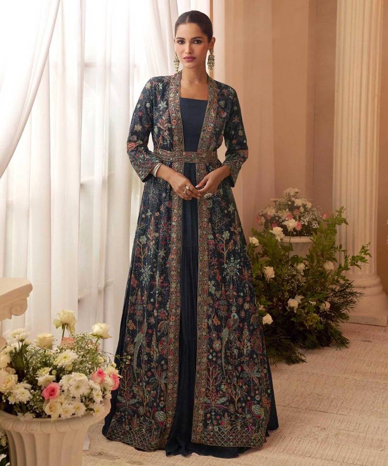 Navy blue chinon silk anarkali jacket suit with heavy zari, thread and sequins work, free-size stitched.