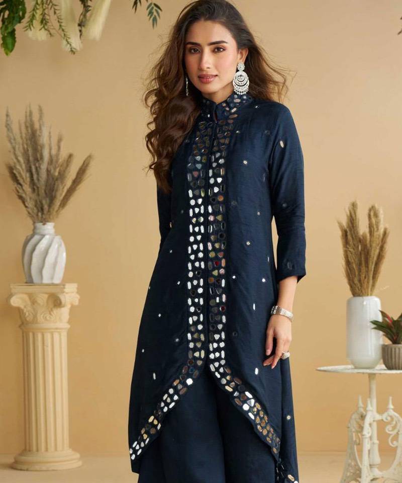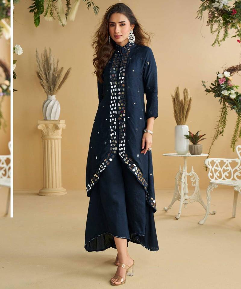 | Product Name | Navy Blue Golden Embroidery And Gota Work Real Silk Straight Top Pant Full Stitched Free Size | |