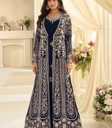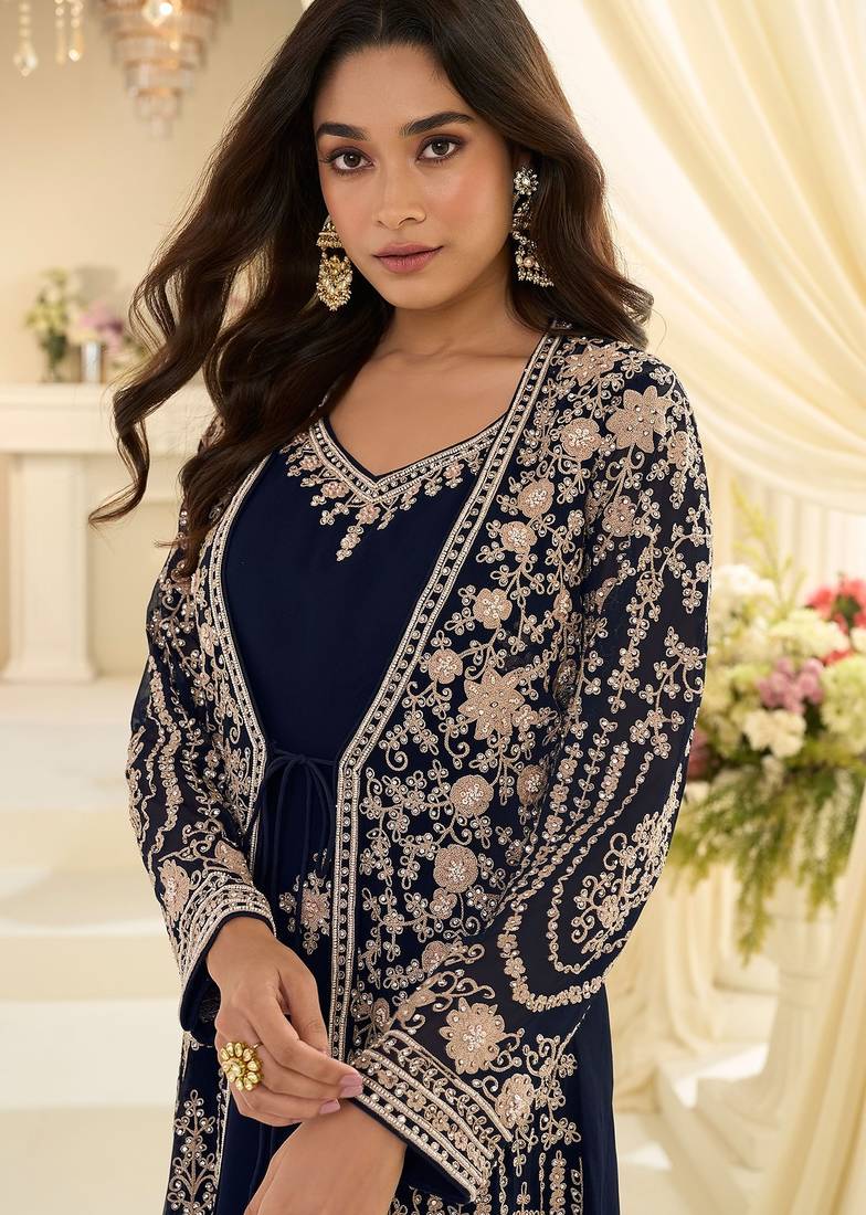 Navy blue silk blend sequins work salwar suits free size up to 42 stitched