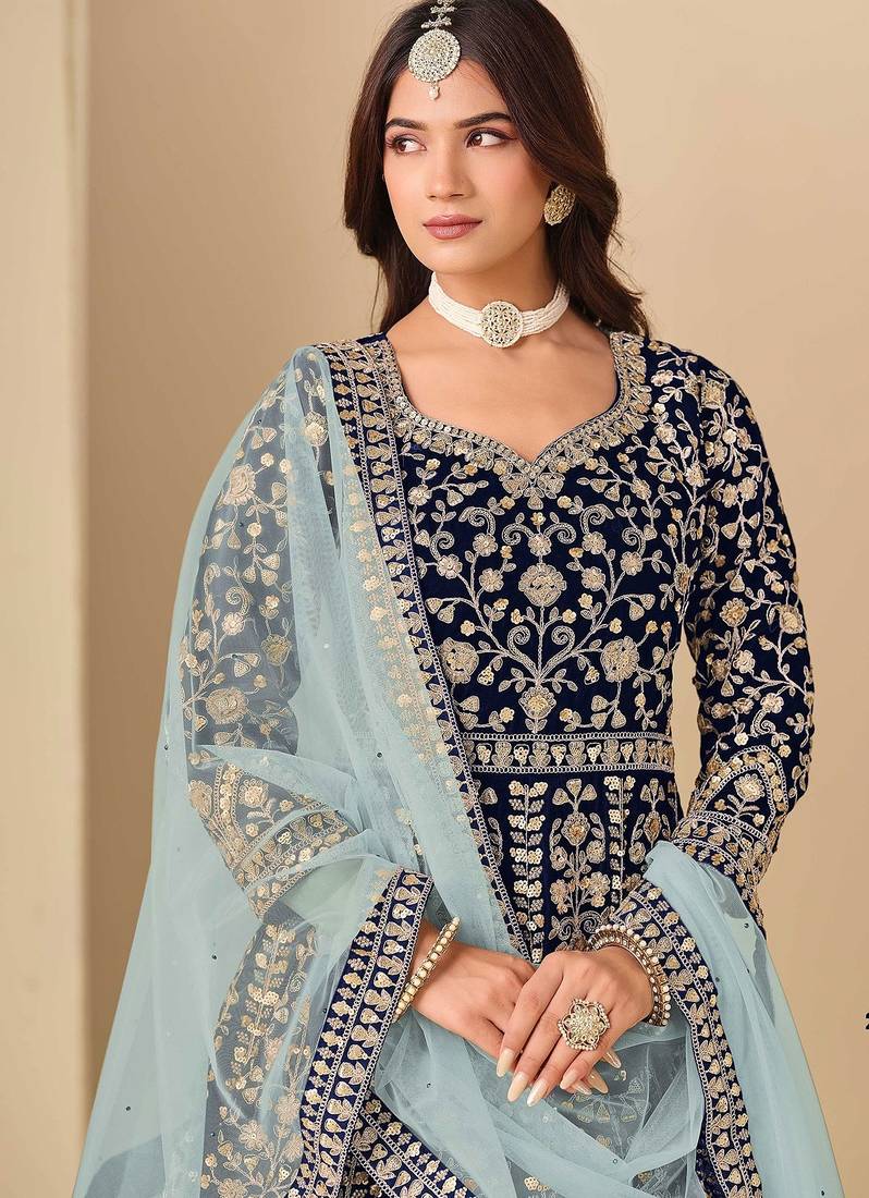 Navy blue velvet sequins work semi stitched salwar suits suits size up to 42