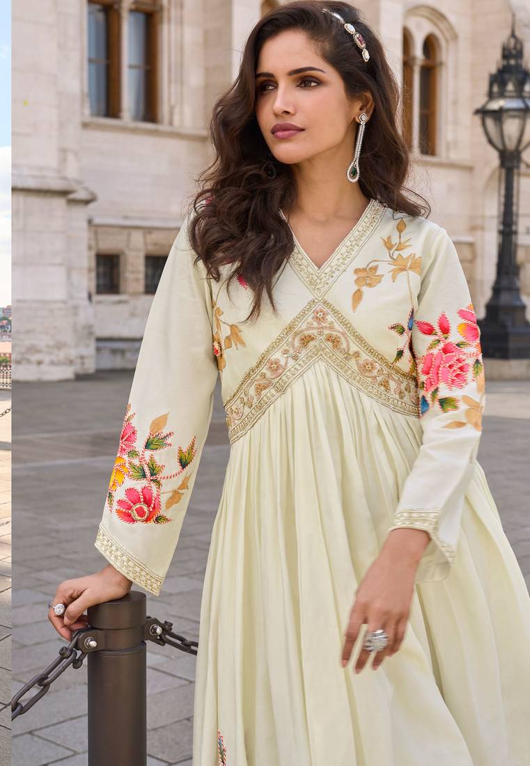 | Product Name | Off White Art Silk Sequins Readymade Suits Free Size Up To 42 | |