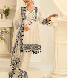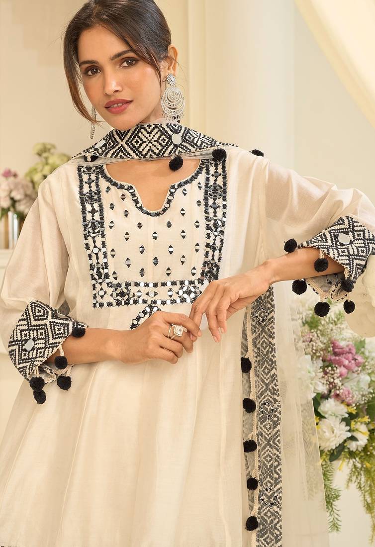 Off white silk mirror work semi stitched salwar suits suits size up to 42