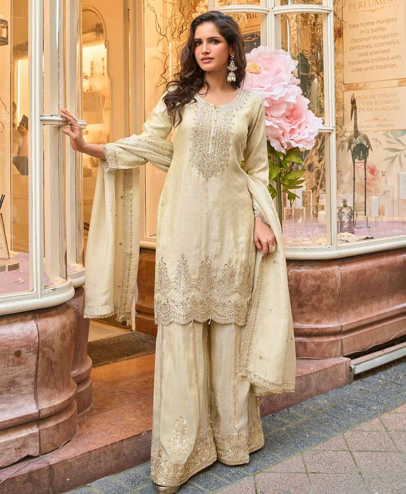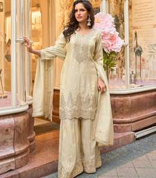 | Product Name | Off White Zari Embroidery, Sequins & Embellished Work Viscose Short Top Gharara, Free Size Upto 42" | |