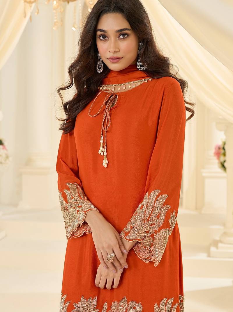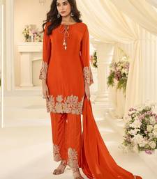 Orange silk blend sequins work salwar suits free size up to 42 stitched