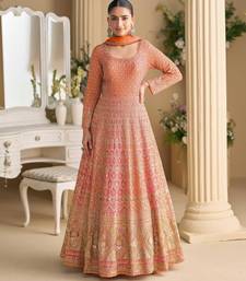 Peach georgette anarkali gown pant suit with heavy thread, zari and sequins work, free-size stitched.