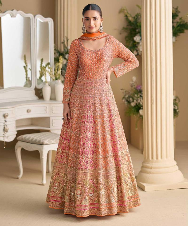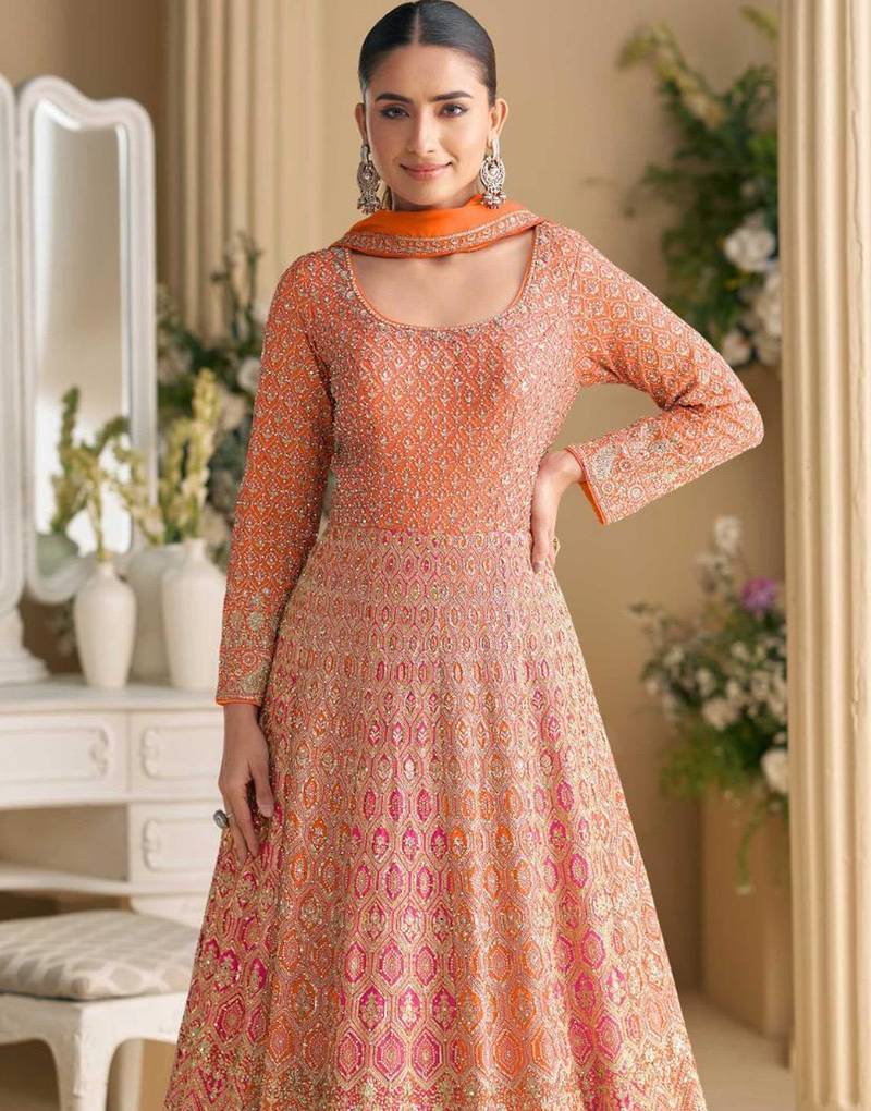 | Product Name | Peach Georgette Anarkali Gown Pant Suit With Heavy Thread, Zari And Sequins Work, Free Size Stitched. | |