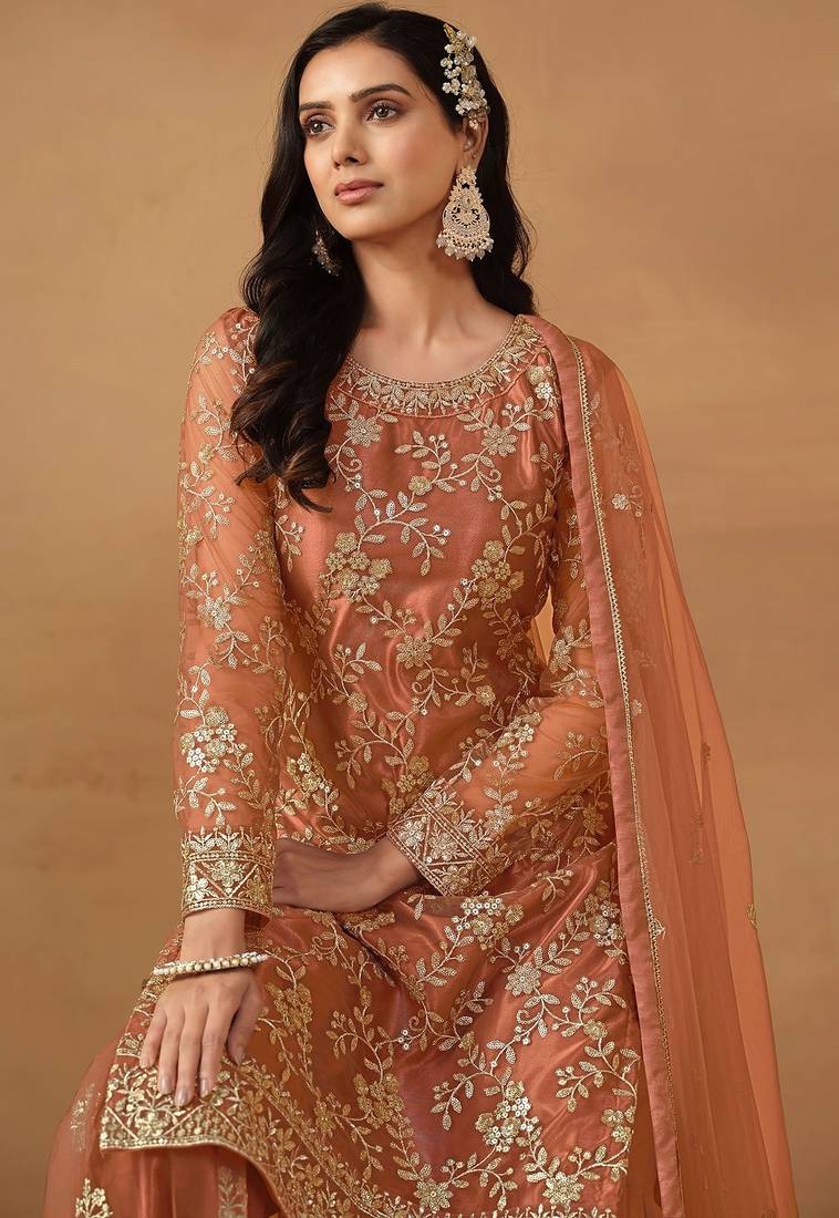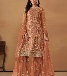 Peach net embroidery & sequins semi stitched suit size up to 42
