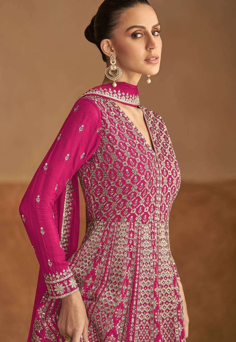 | Product Name | Pink Embroidery & Sequins Work Chinon Gown Free Size Stitching (Size Upto 42") | |