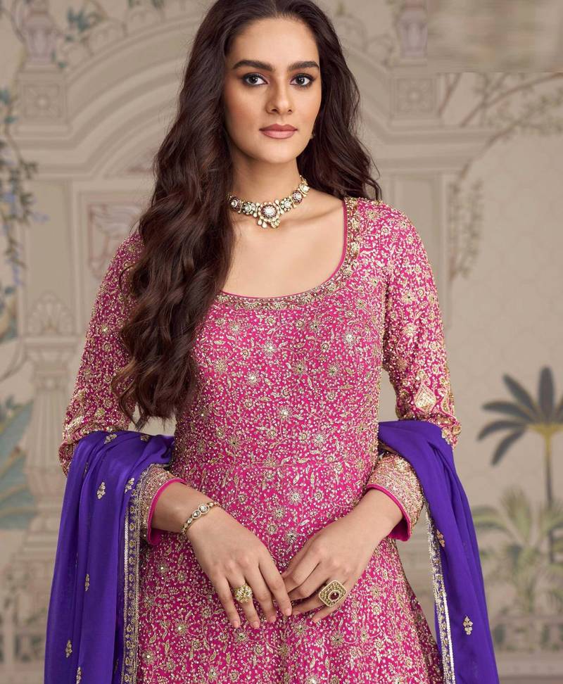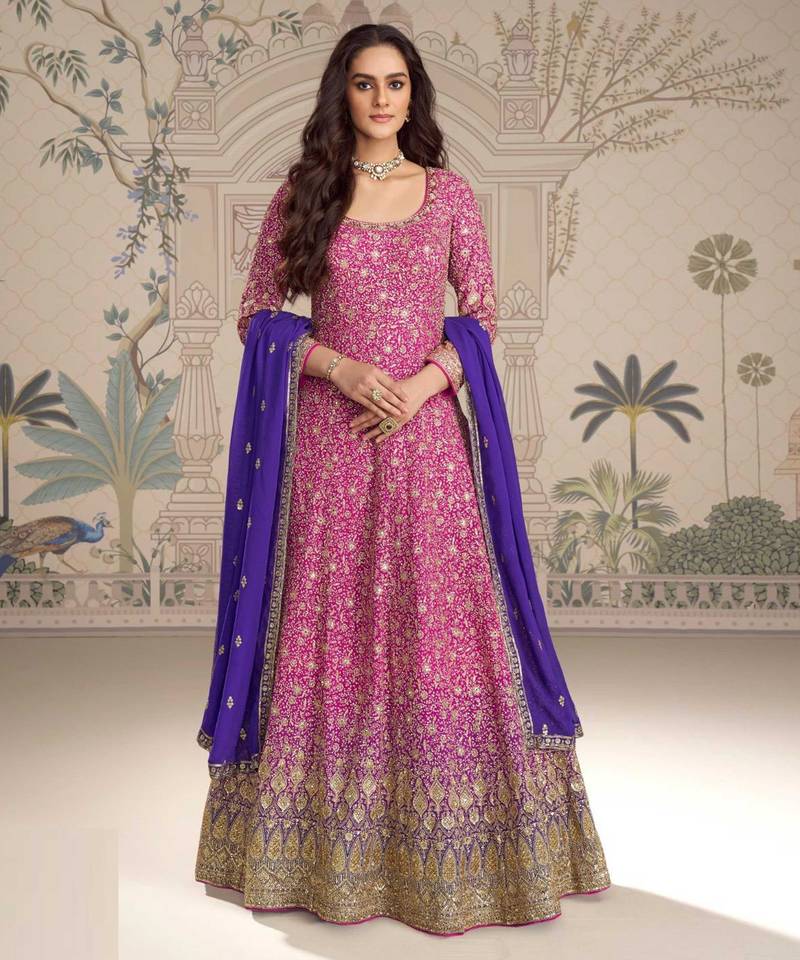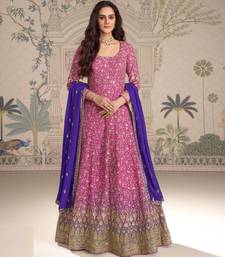 Pink georgette anarkali gown suit with heavy embroidery, sequins, thread, seroski & zarkan, free-size stitched.