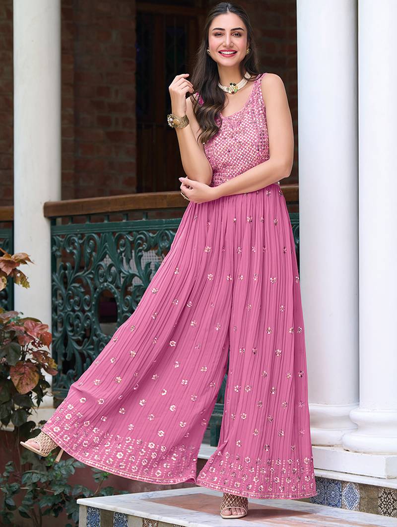 | Product Name | Pink Georgette Jumpsuit With Embroidery And Sequins Work, Free Size Stitched (Up To 42"). | |
