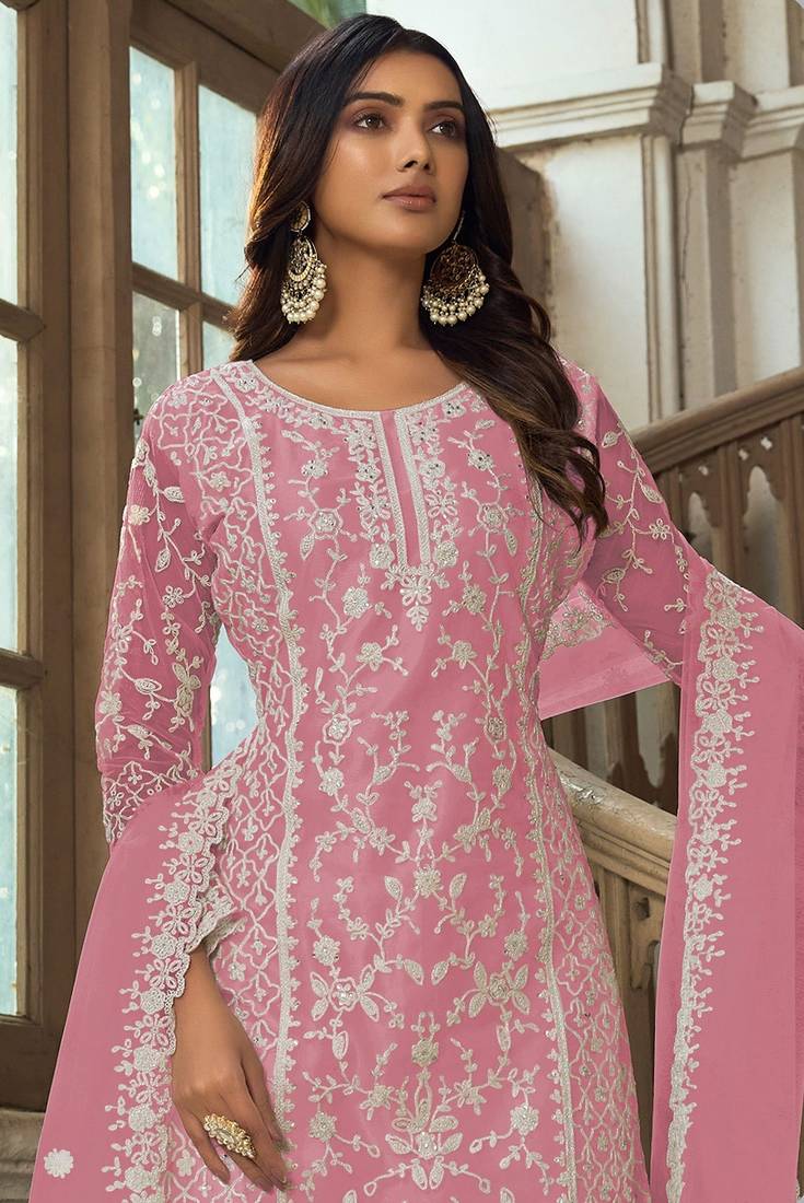 Pink net sequins work semi stitched salwar suits suits size up to 42