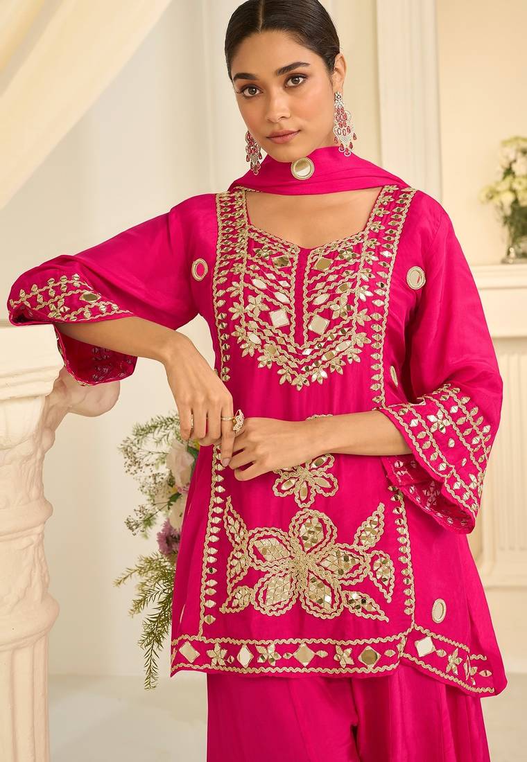 | Product Name | Pink Silk Blend Mirror Work Salwar Suits Free Size Up To 42 | |