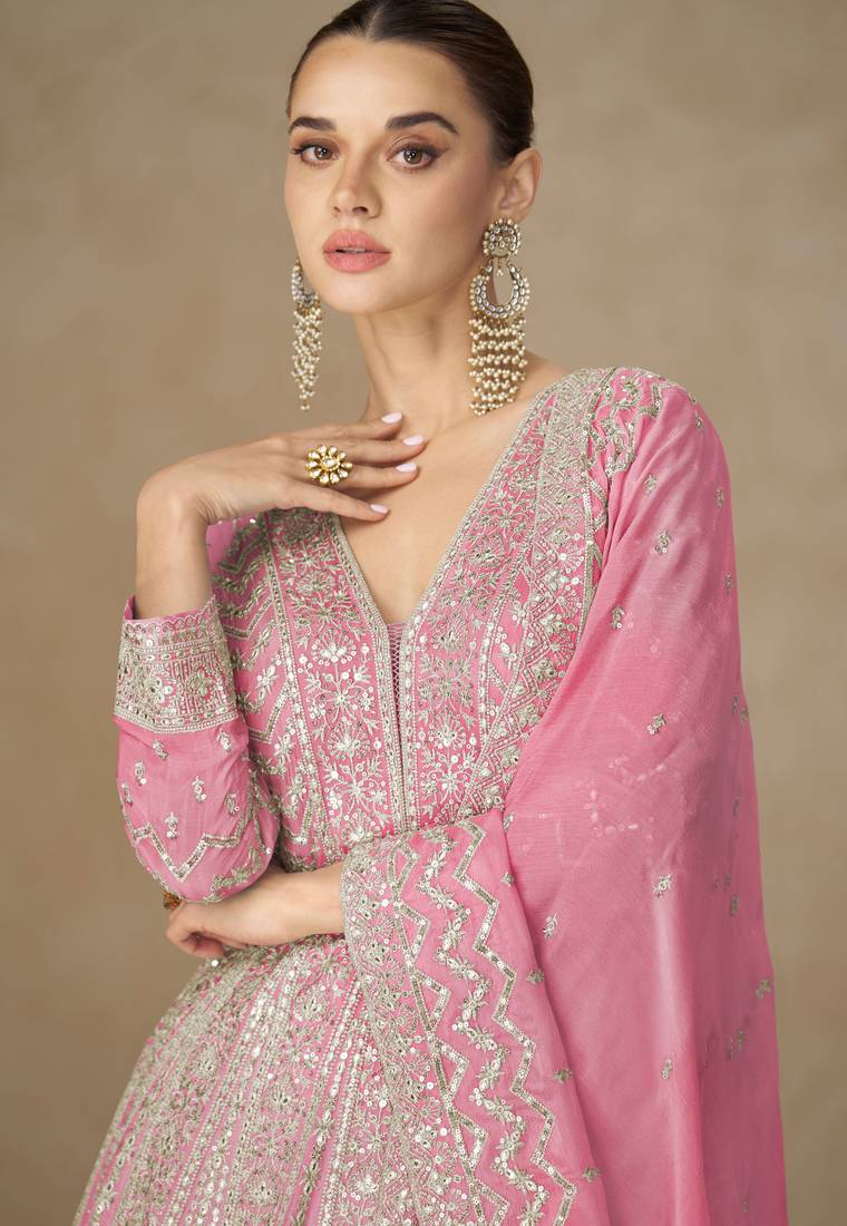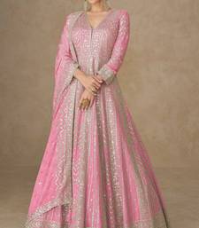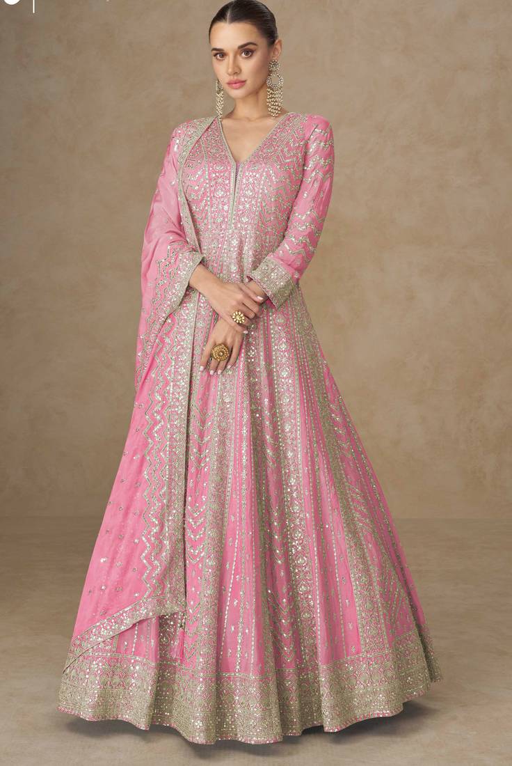 Pink zari emboidery and sequince work chinnon silk anarkali - free size stitching (size upto 42") stitched