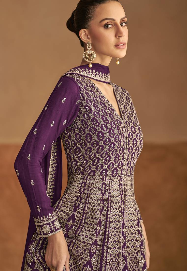 | Product Name | Purple Embroidery & Sequins Work Chinon Gown Free Size Stitching (Size Upto 42") | |