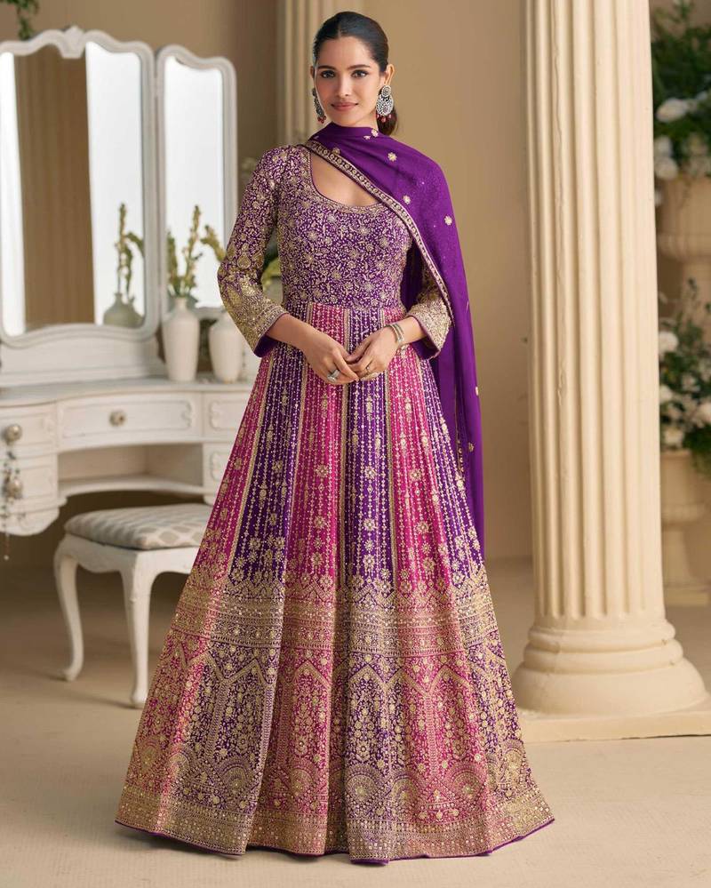 | Product Name | Purple Pink Georgette Anarkali Gown Pant Suit With Heavy Thread, Zari And Sequins Work, Free Size Stitched. | |