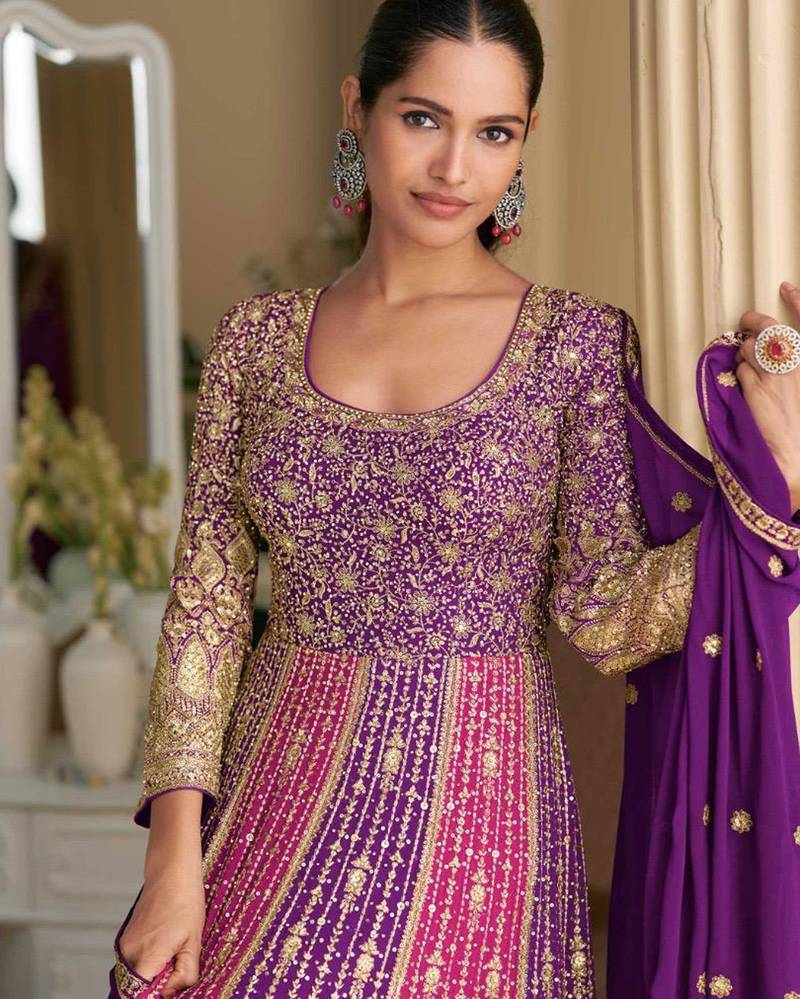 Purple-pink georgette anarkali gown pant suit with heavy thread, zari and sequins work, free-size stitched.