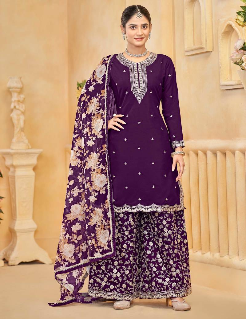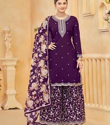 | Product Name | Purple Roman Silk Straight Palazzo Suit With Zari Embroidery, Sequins & Printed Dupatta, Free Size Stitched. | |
