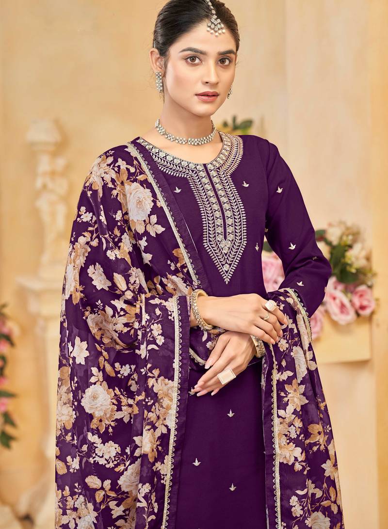 Purple roman silk straight palazzo suit with zari embroidery, sequins & printed dupatta, free-size stitched.
