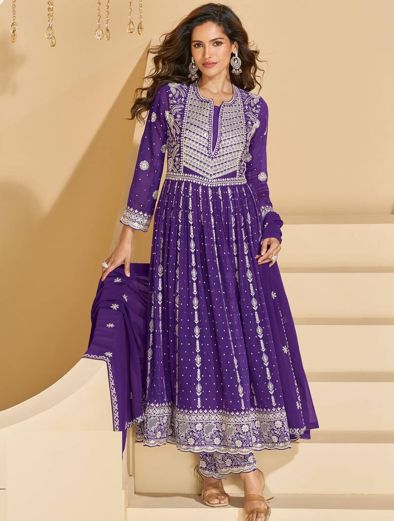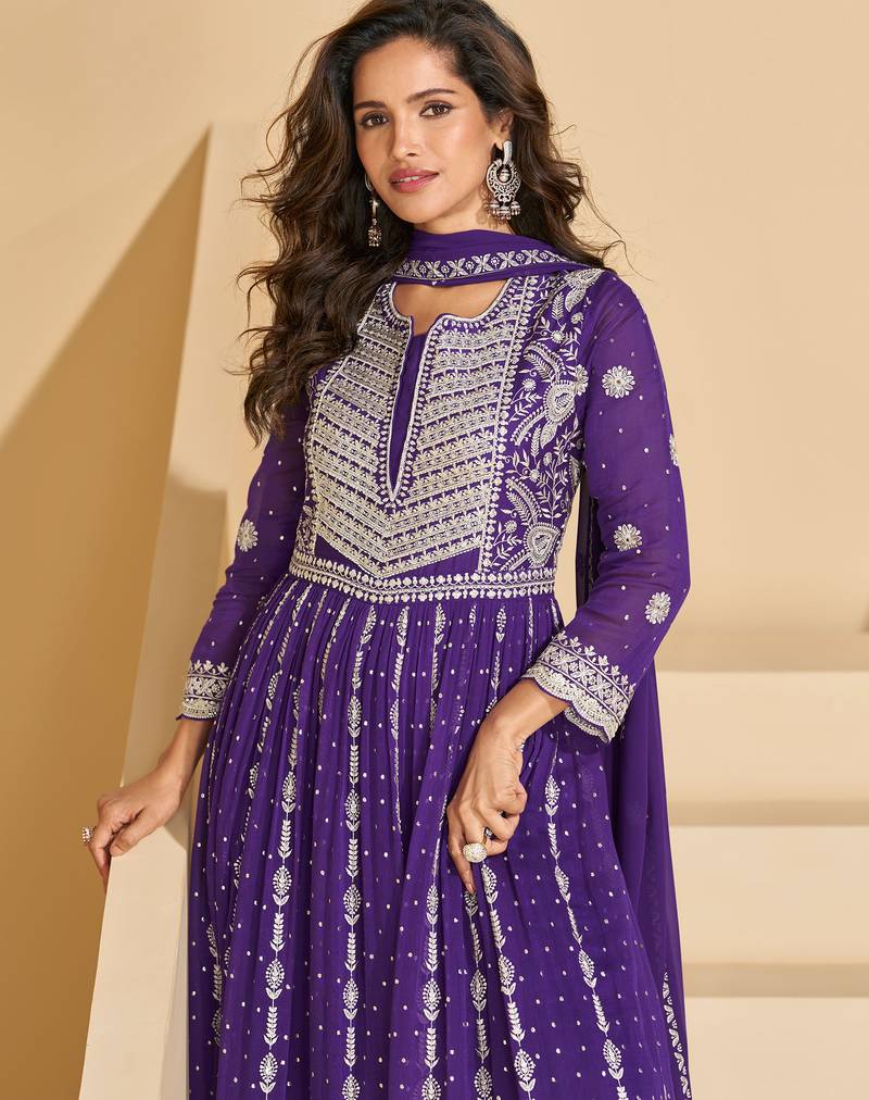 Purple thread and sequins embroidery georgette straight top palazzo suit--full stitched free size