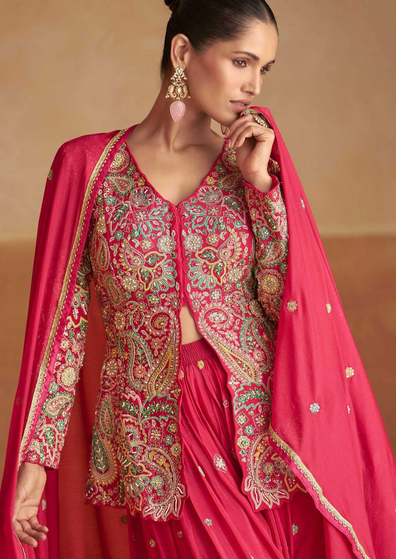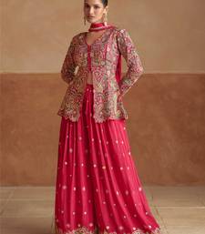 Purple zari sequins stone & beads work chinnon silk slit top palazzo suit – free size stitching (up to 42"). stitched