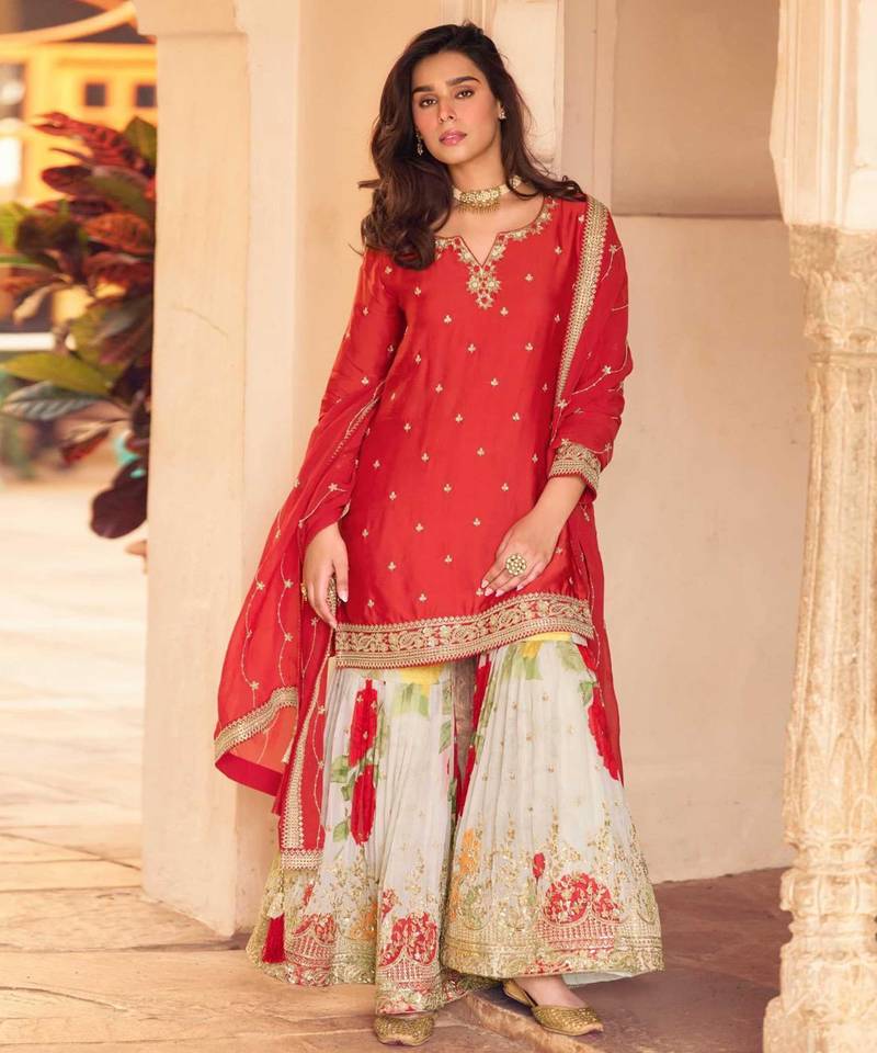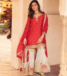 | Product Name | Red Chinon Silk Straight Top Palazzo Suit With Embroidery And Stone Sequin Work, Free Size Stitched. | |