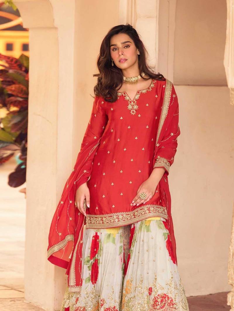 Red chinon silk straight top palazzo suit with embroidery and stone sequin work, free-size stitched.