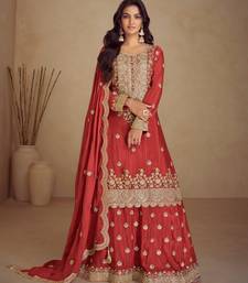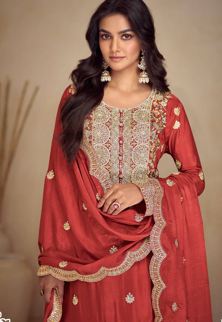 | Product Name | Rust Embroidery , Sequins & Hand Work Chinnon Palazzo Straight Free Size Stitching (Size Upto 42") | |