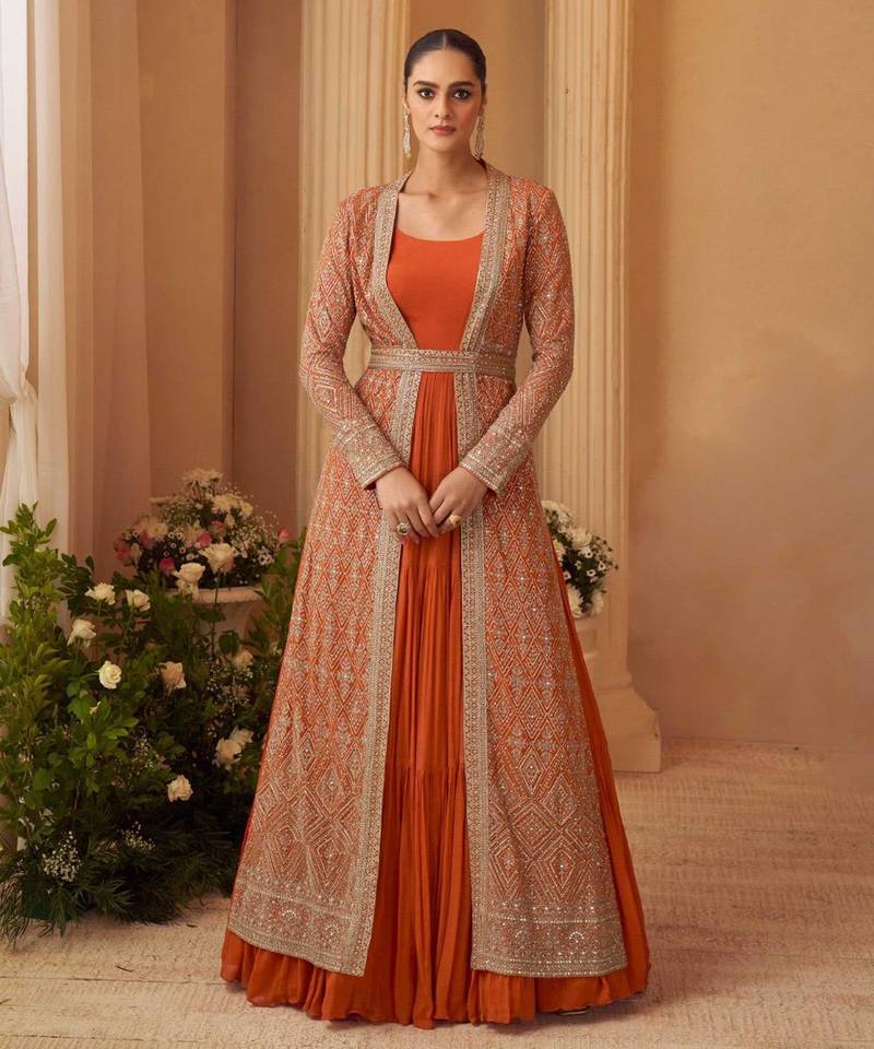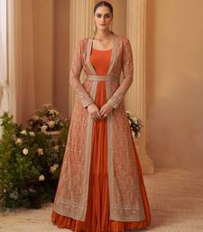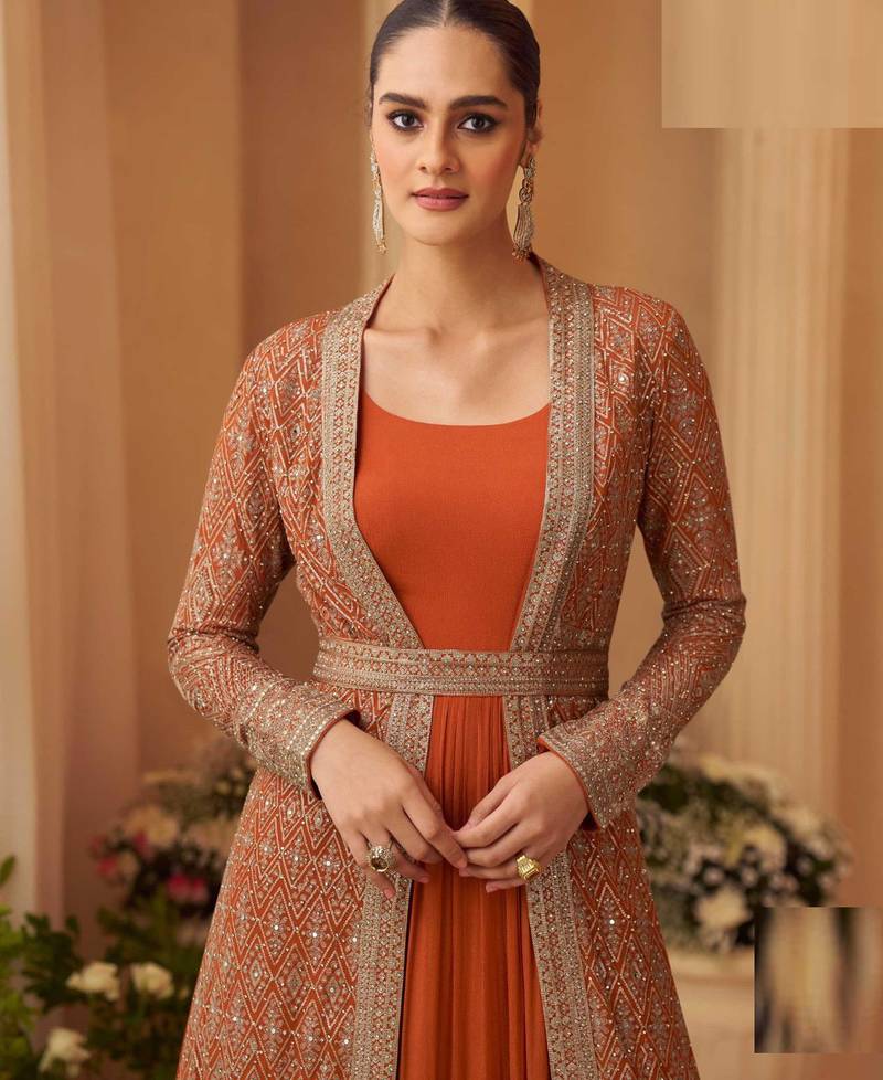 | Product Name | Rust Orange Chinon Silk Anarkali Jacket Suit With Heavy Zari, Thread And Sequins Work, Free Size Stitched. | |