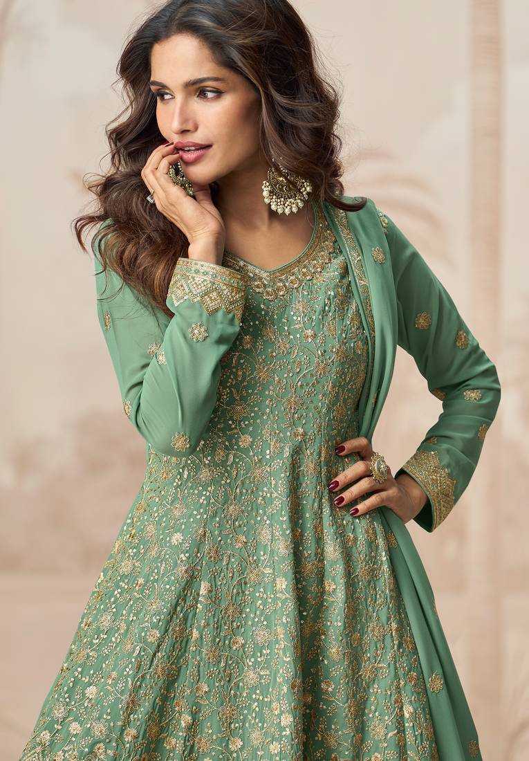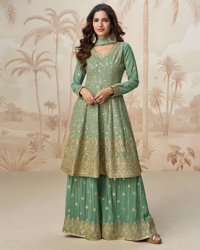 Sea green zari embroidery , sequins & gota work chinon georgette anarkali palazzo - free size stitching (size upto 42") stitched