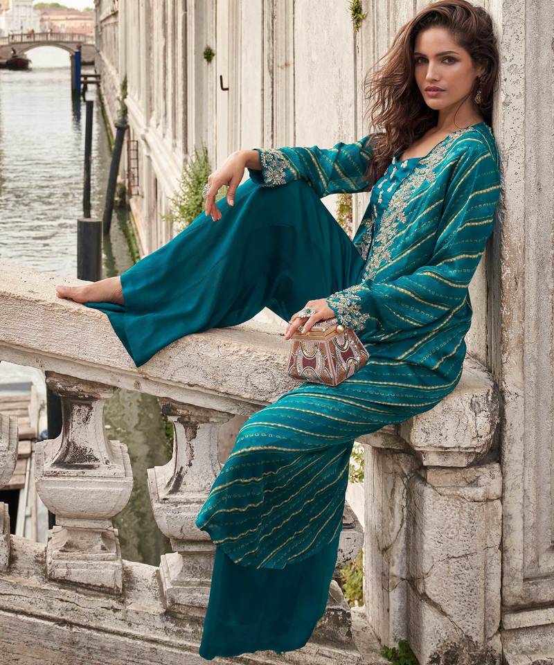 | Product Name | Teal Blue Chinon Silk Blouse Palazzo Suit With Hand, Mirror, Embellished And Sequin Work, Free Size Stitched. | |