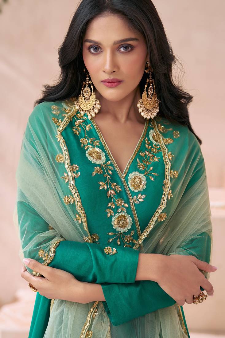 | Product Description | • Teal Green Silk Gown Suti.