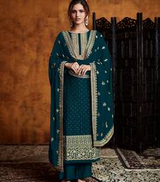 Teal green georgette palazzo suit with embroidery and sequins work, free-size stitched.