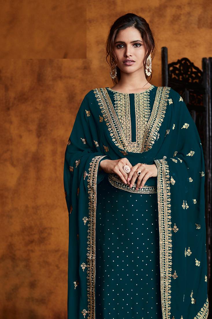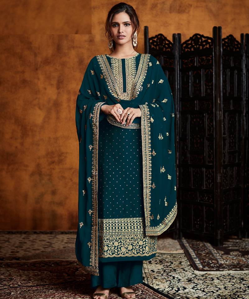 | Product Name | Teal Green Georgette Palazzo Suit With Embroidery And Sequins Work, Free Size Stitched. | |