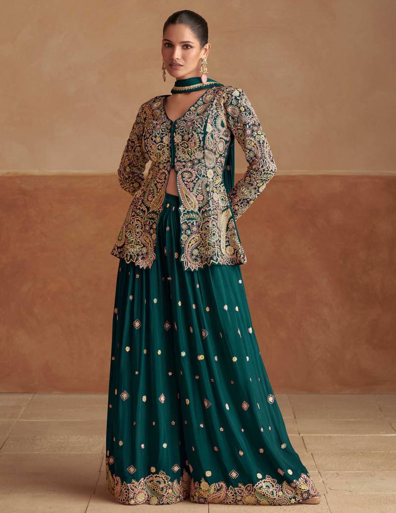 Teal green zari sequins stone & beads work chinnon silk slit top palazzo suit – free size stitching (up to 42") stitched