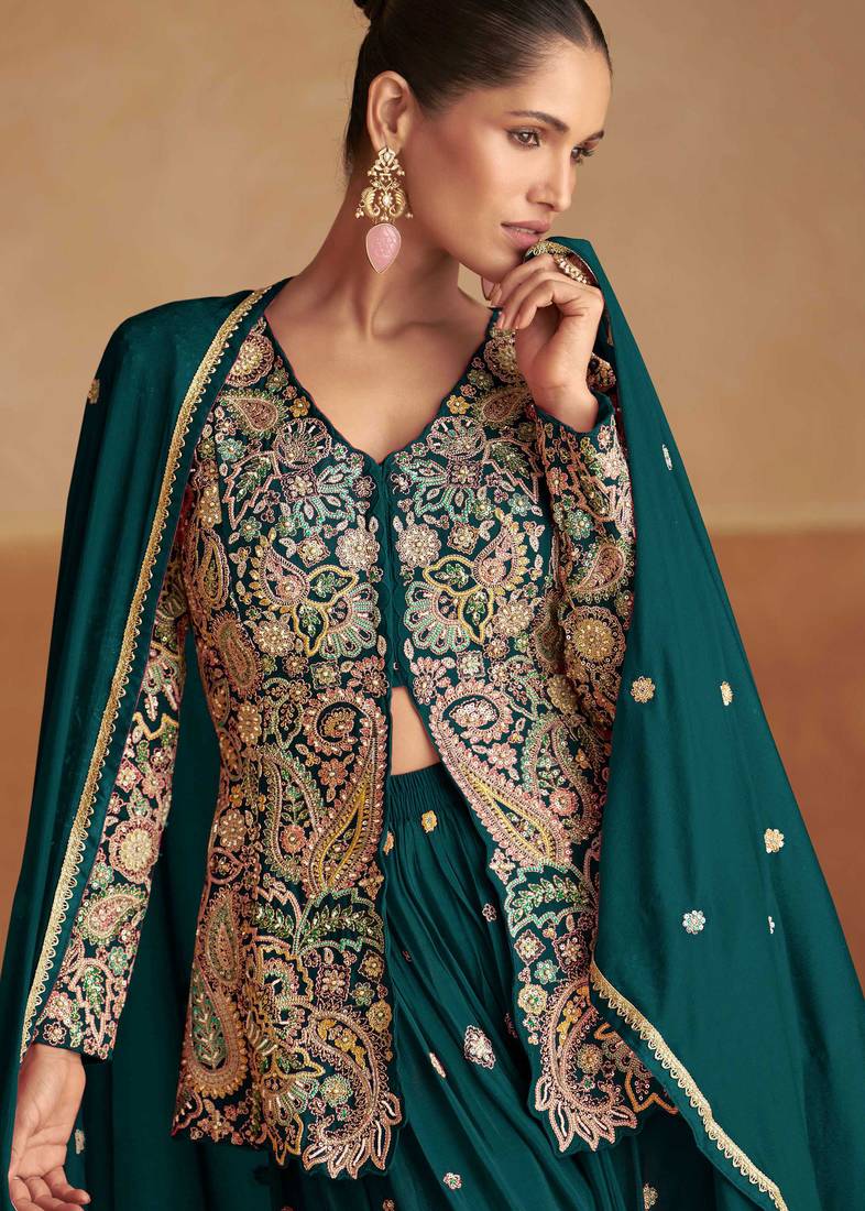 | Product Name | Teal Green Zari Sequins Stone & Beads Work Chinnon Silk Slit Top Palazzo Suit – Free Size Stitching (Up To 42") | |