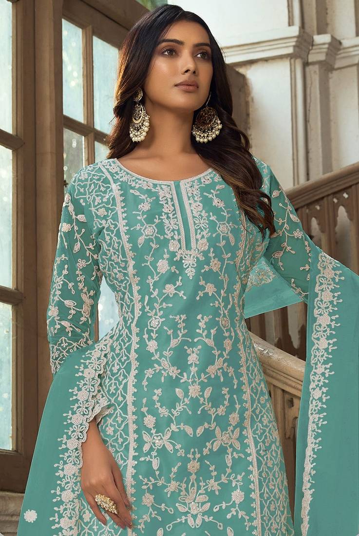 Turquoise net sequins work semi stitched salwar suits suits size up to 42