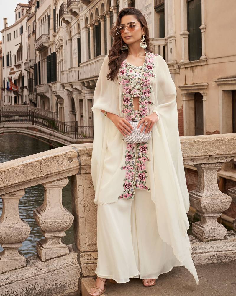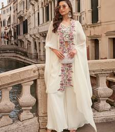 | Product Name | White Embroidered Embellished Sequince Chinon Silk Blouse Palazzo Suit Free Size Stitched(Size Upto 42") | |