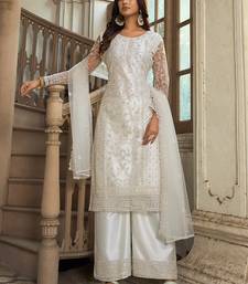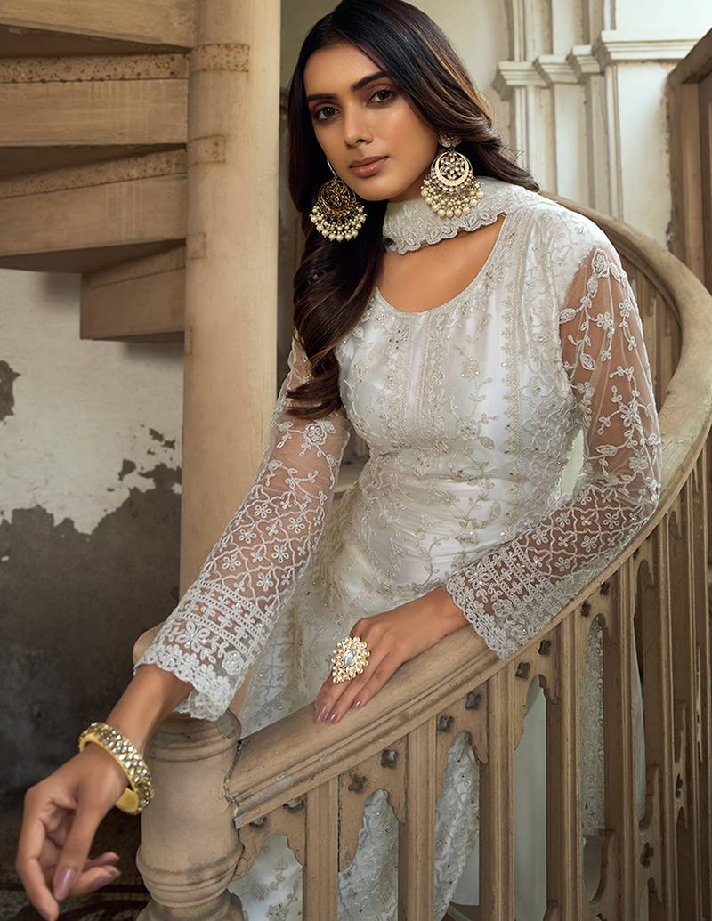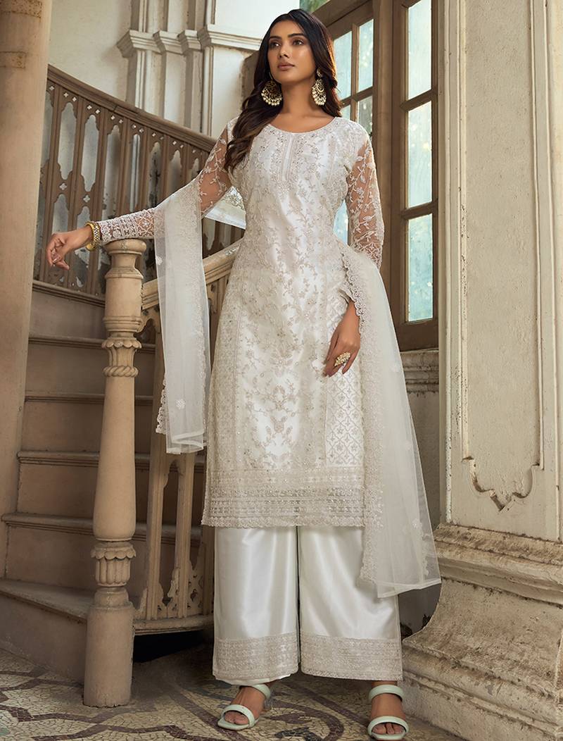 | Product Name | White Net Straight Palazzo Suit With Zari Embroidery And Sequins Work, Free Size Stitched (Up To 42"). | |