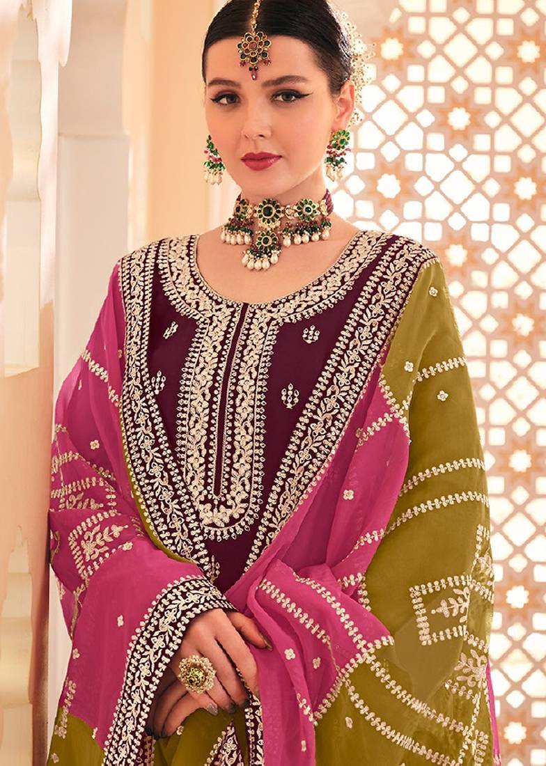 Wine chiffon sequins work semi stitched salwar suits suits size up to 42