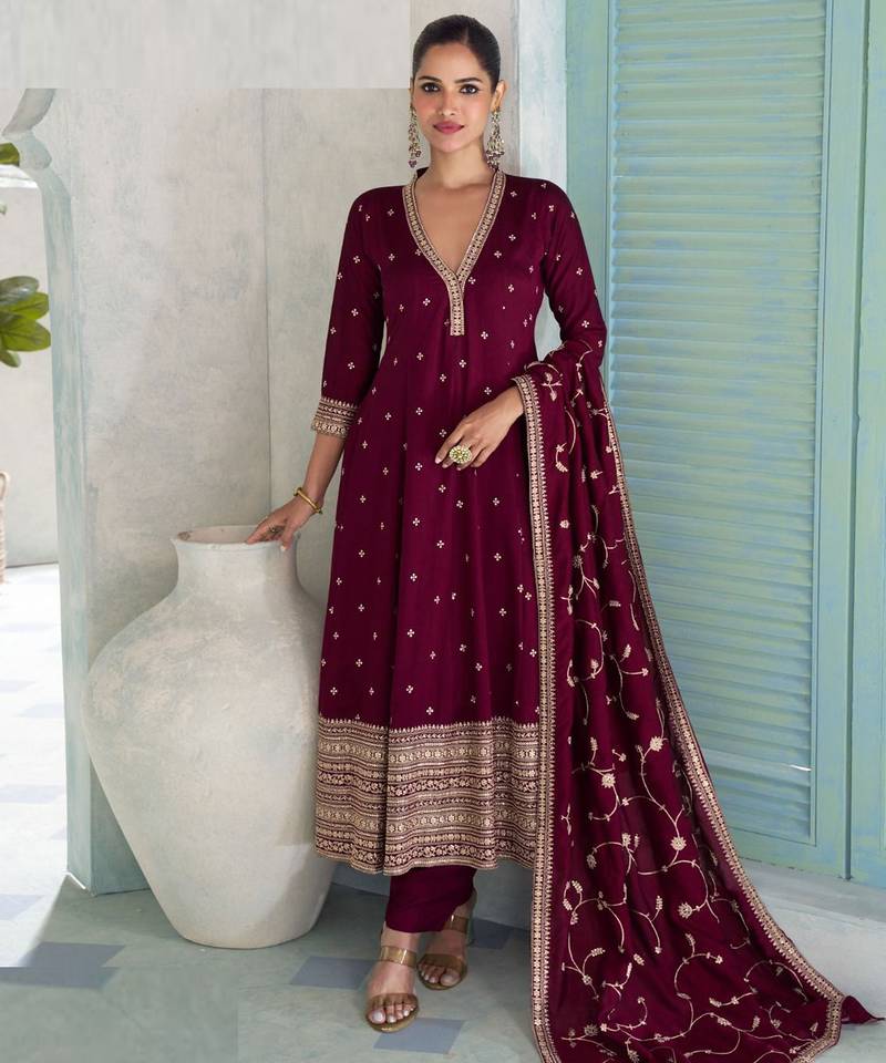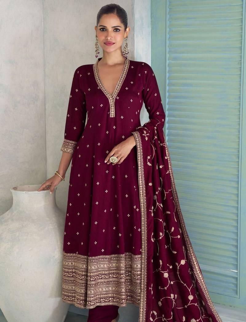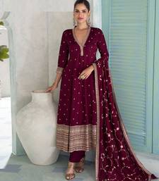 | Product Name | Wine Silk Anarkali Kurti Pant Suit With Zari, Sequins, Gota & Mirror Style Embellishments, Free Size Stitched. | |
