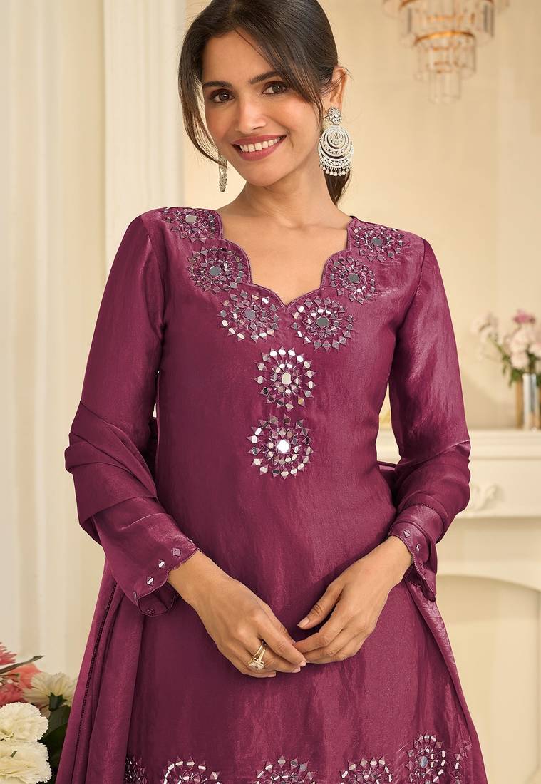 | Product Name | Wine Silk Blend Mirror Work Salwar Suits Free Size Up To 42 | |