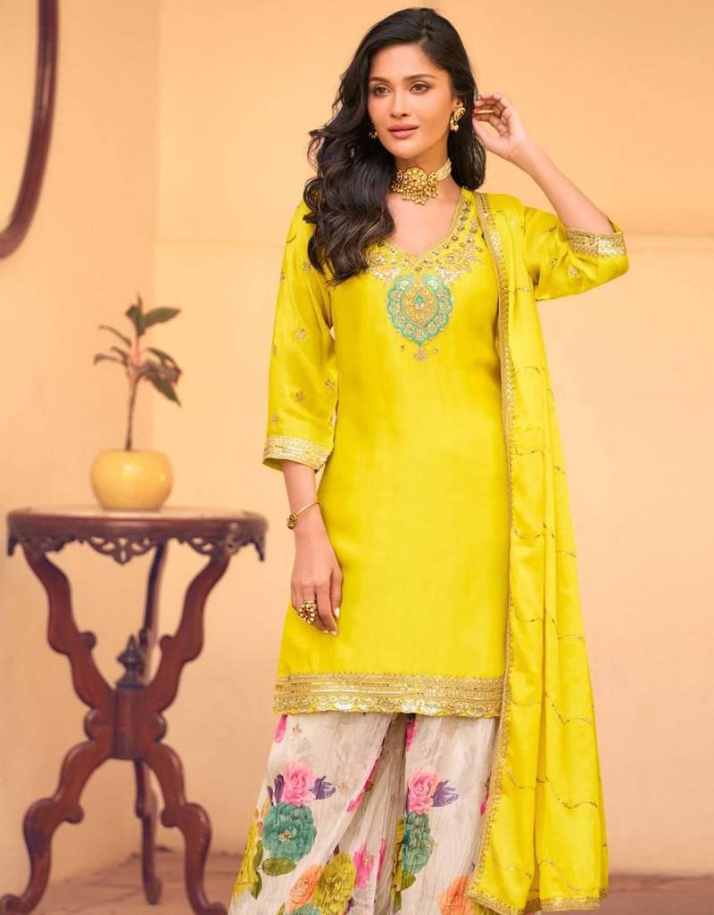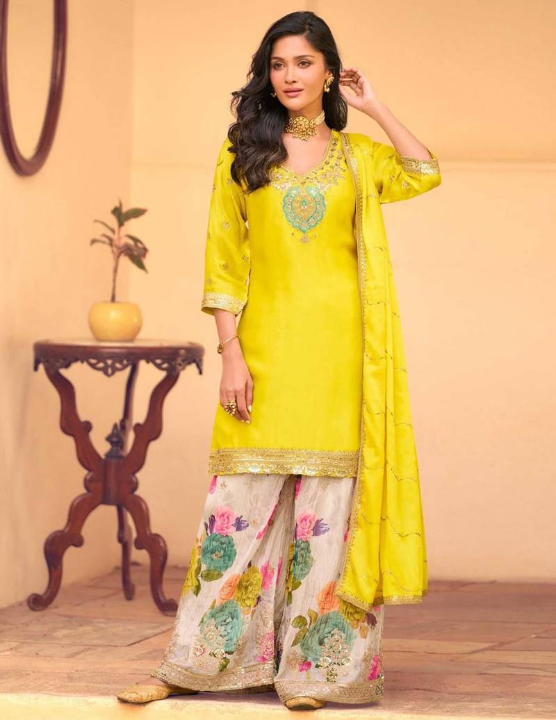 Yellow chinon silk straight top palazzo suit with embroidery and stone sequin work, free-size stitched.