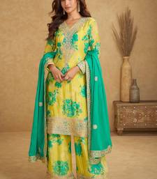 | Product Name | Yellow Embroidery,Sequins Work & Digital Printed Chinnon Straight Palazzo Suit Free Size Stitching (Size Upto 42") | |
