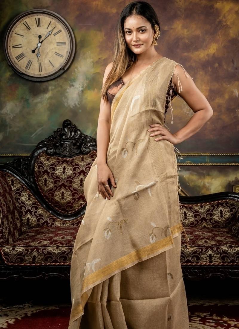 | Product Description | The Metallic Beige Linen Bengal Handloom Saree Features Antique Gold & Silver Zari Flower Bud Motifs Scattered Delicately Across The Body, Finished With A Glowing Golden Border.