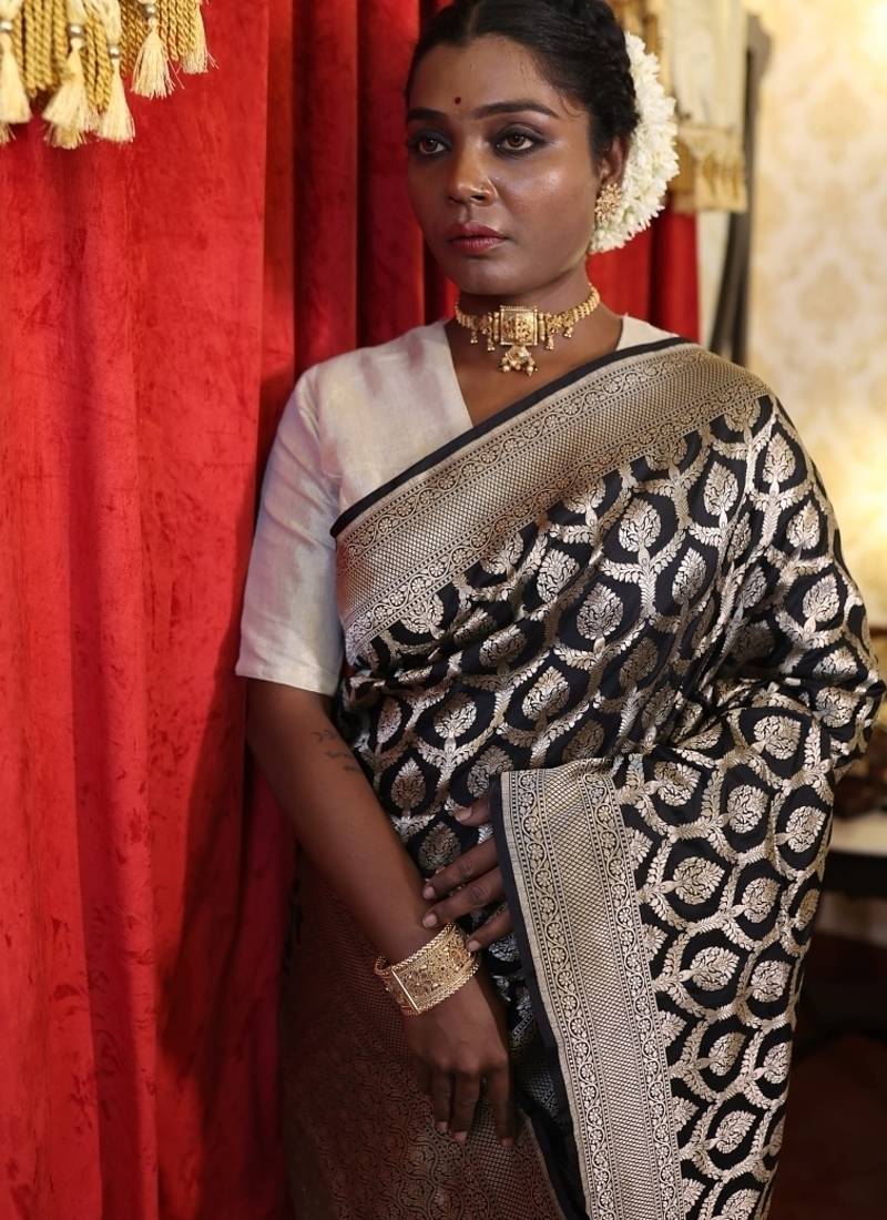 | Product Description | The Black Pure Katan Handloom Banarasi Saree Is A Celebration Of Heritage & Opulence. Intricately Adorned With All Over Buta & Jaal Motifs Woven In Matte Gold Zari, It Reflects A Quiet Luxury—Making A Powerful Statement Through Its Refined Detailing.